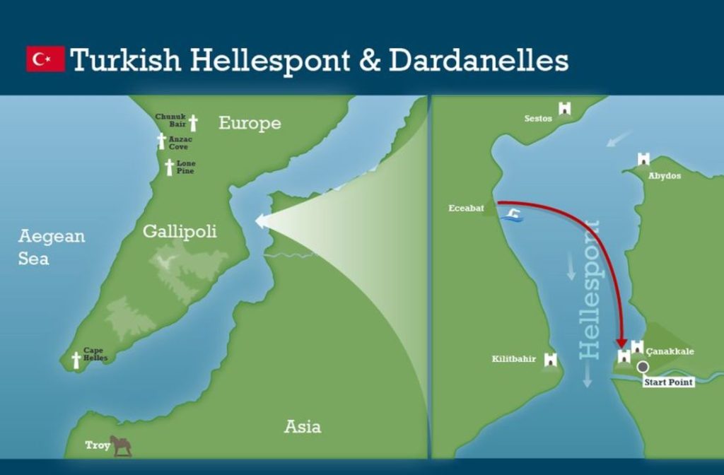 The naval battle of the Dardanelles in 1915 was first Allied attempt to force a way through to Constantinople and come to the aid of Russia. It was a disaster, with three Allied warships being sunk within minutes of each other – all still resting as a war grave beneath the course of the swim. The failure of the Allies to breach the Dardanelles by sea was the reason for attempting a land invasion on the Gallipoli peninsula.